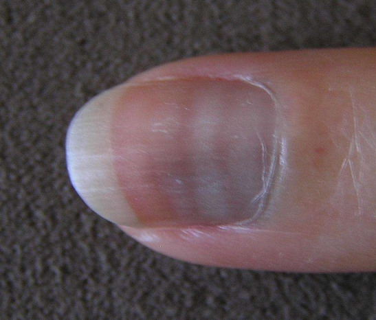 甲板上涌现横向、平滑、无奈涉及的白线,与甲半月平行,长度与甲板的宽度差未几,无甲凹陷,这种称为米氏(Mees)线,可能是慢性肾病、终末期肾病惹起,也可能是重金属中毒惹起,能够通过白线的地位推测患病的光阴。