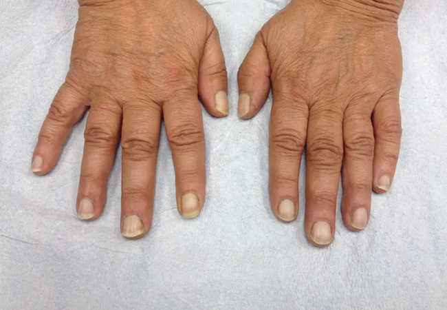 这是一名肾内科医生分享的患者手指照片,咱们能够看到,患者的指甲色彩分为左右两层,白色跟 红色约各占一半。经由反省,这名59岁的患者患有慢性肾病,而这种“红白分层”的指甲表示恰是肾病招致的。